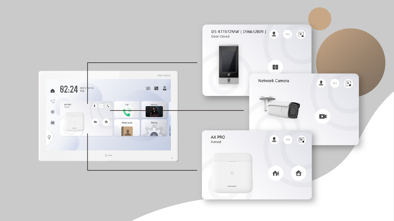 ![]() | Gestión todo en uno Con Hik-Connect integrado en la estación interior, todos los dispositivos Hikvision (cámaras IP, NVR, alarma de intrusión, intercomunicador de video y más), junto con sistemas que incluyen control de acceso, intercomunicador y monitoreo de video, se pueden administrar y monitorear fácilmente. Además, los usuarios pueden verificar fácilmente el estado del dispositivo y de la red, la batería y la temperatura ambiental, con todo en una sola pantalla. |