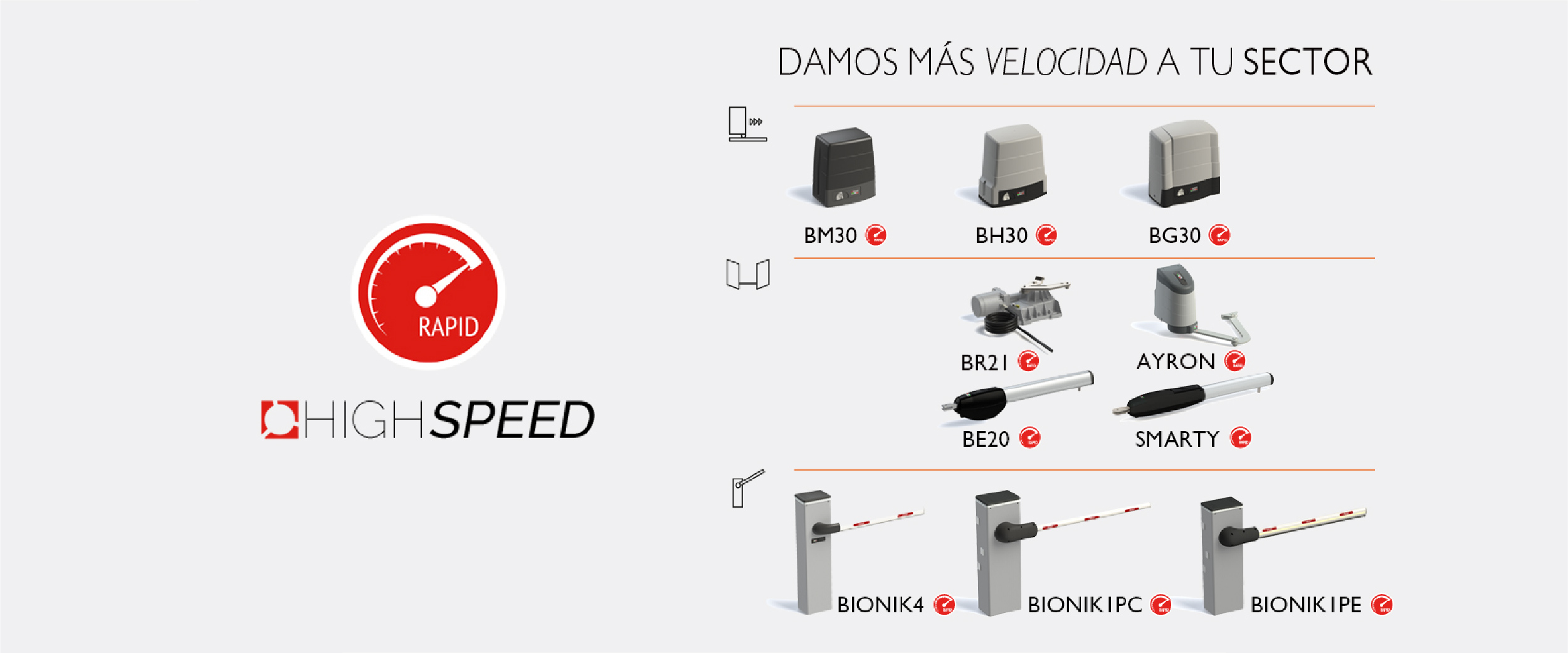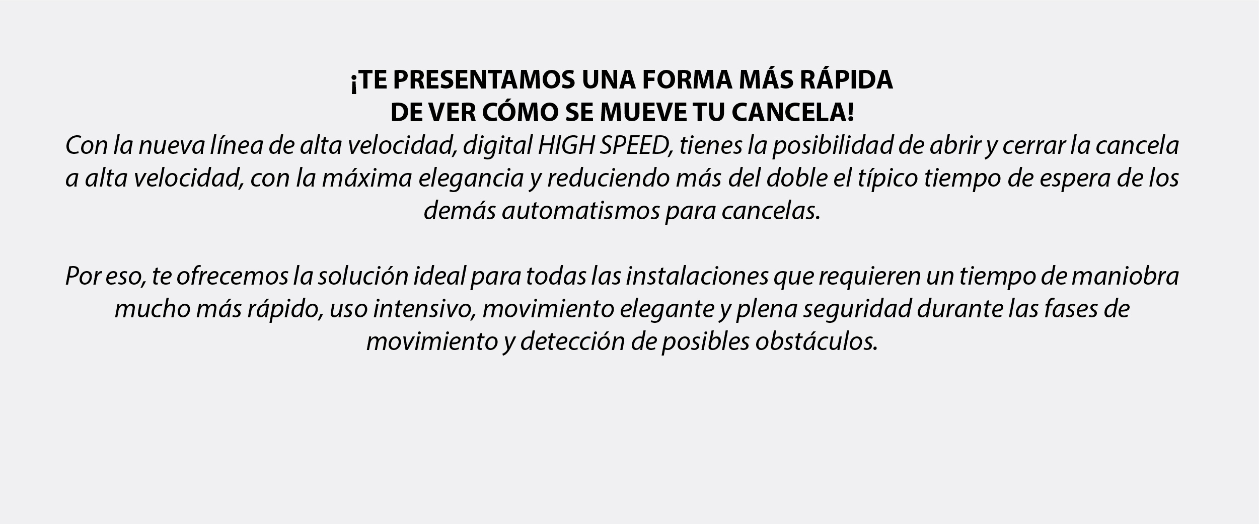 La nueva línea HIGH SPEED te permite abrir con rapidez, es potente y fiable y un 100% más rápida que los motores convencionales con tecnología de 230 V CA o 24 V CC.