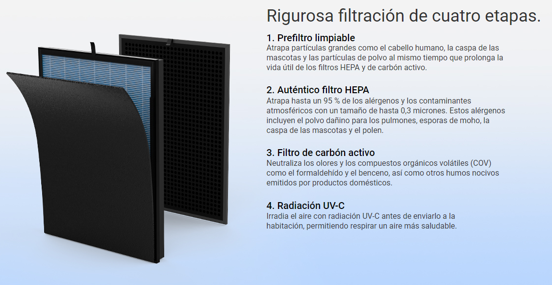 El purificador de aire mediante radiación UV-C de EZVIZ cuenta con un sistema de filtración de cuatro etapas para purificar y desinfectar el aire. El sistema está compuesto por un prefiltro, un filtro HEPA, un filtro de carbón activo y una lámpara UV-C. Además, tiene toda la potencia necesaria para absorber, eliminar y neutralizar las sustancias nocivas del aire que se respira.