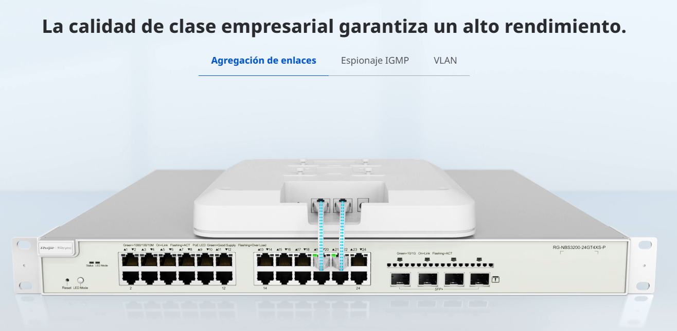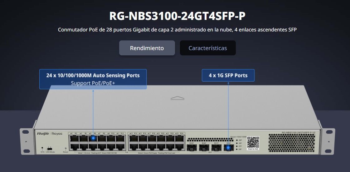 24 puertos 10/100 / 1000Base-T (admiten PoE y PoE +), 4 puertos SFP 1000Base-X, alimentación PoE de 370 W, admiten administración unificada a través de la plataforma Ruijie Cloud