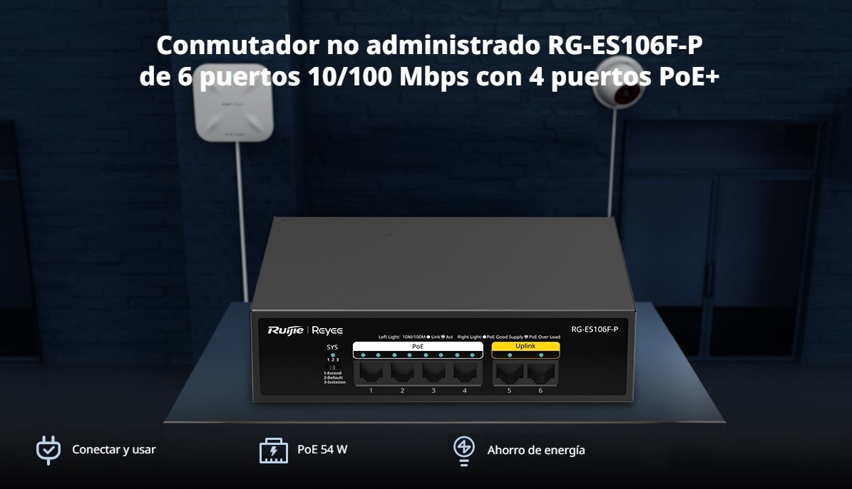 SWITCH DE 6 BOCAS 4 POE 10/100MBPS NO ADMINITRABLE VISIBLE EN CLOUD RUIJIE 54 WATTS RG-ES106F-P