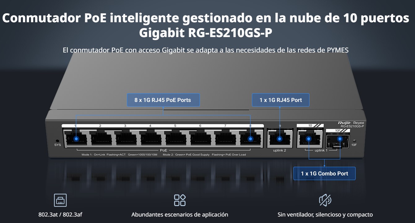 SWITCH GIGABIT DE 10 BOCA 8 POE 10/100/1000MBPS + 2 RJ45 ADMINISTRABLE CLOUD RUIJIE RG-ES210GS-P