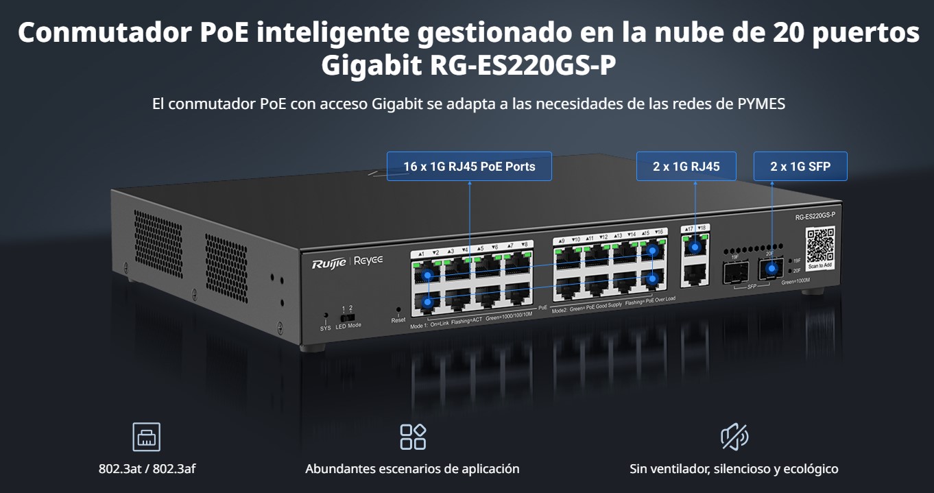 SWITCH GIGABIT DE 20 BOCA 16POE 10/100/1000MBPS+2 RJ45+2 SFP ADMINISTRABLE CLOUD RUIJIE RG-ES220GS-P